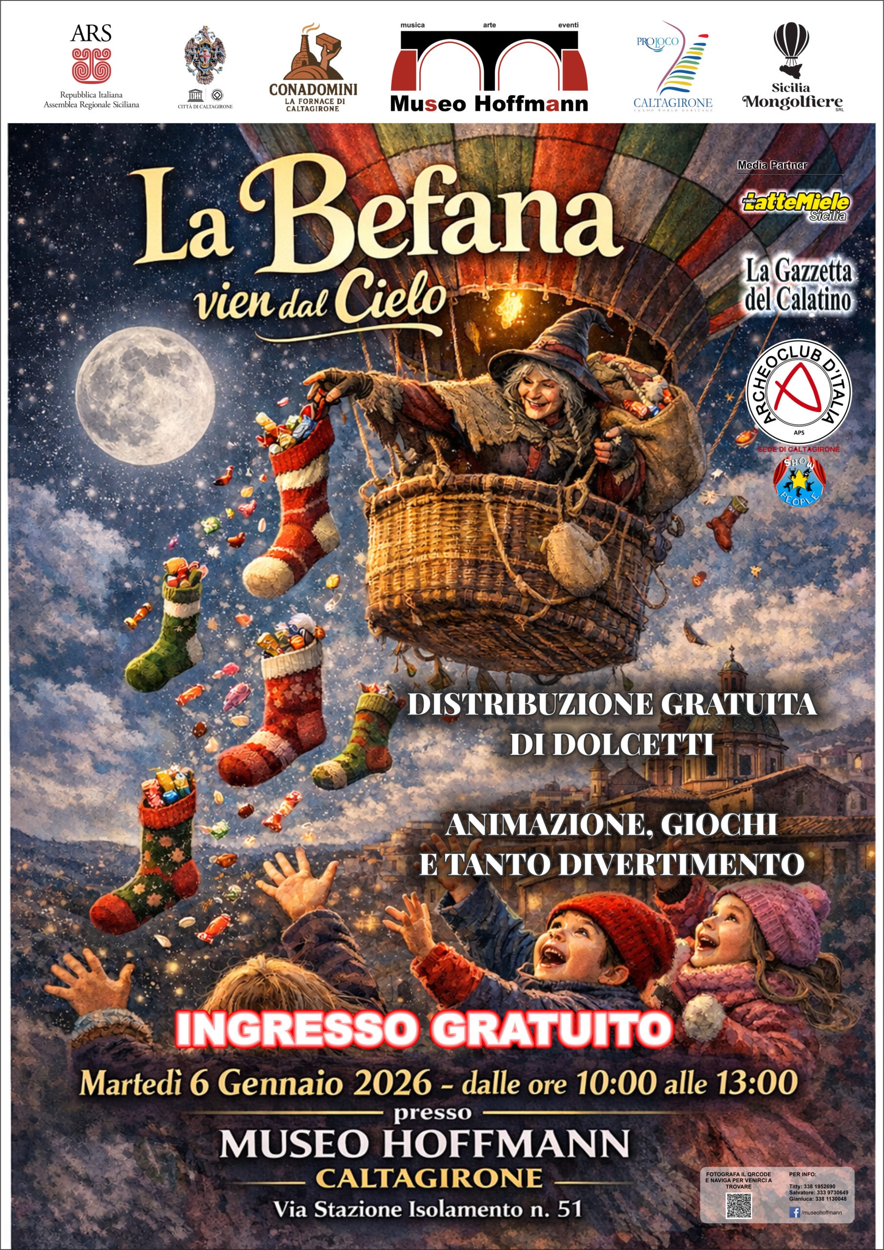 Desde las 10:00 a.m. hasta la 1:00 p.m., en el Museo Hoffmann de Caltagirone, La Befana llegará de una manera realmente espectacular: descendiendo del cielo en un globo aerostático, lista para repartir chocolates y caramelos a los niños presentes. Además, quienes deseen dar un paseo en globo aerostático podrán hacerlo reservando previamente a los números indicados más abajo.